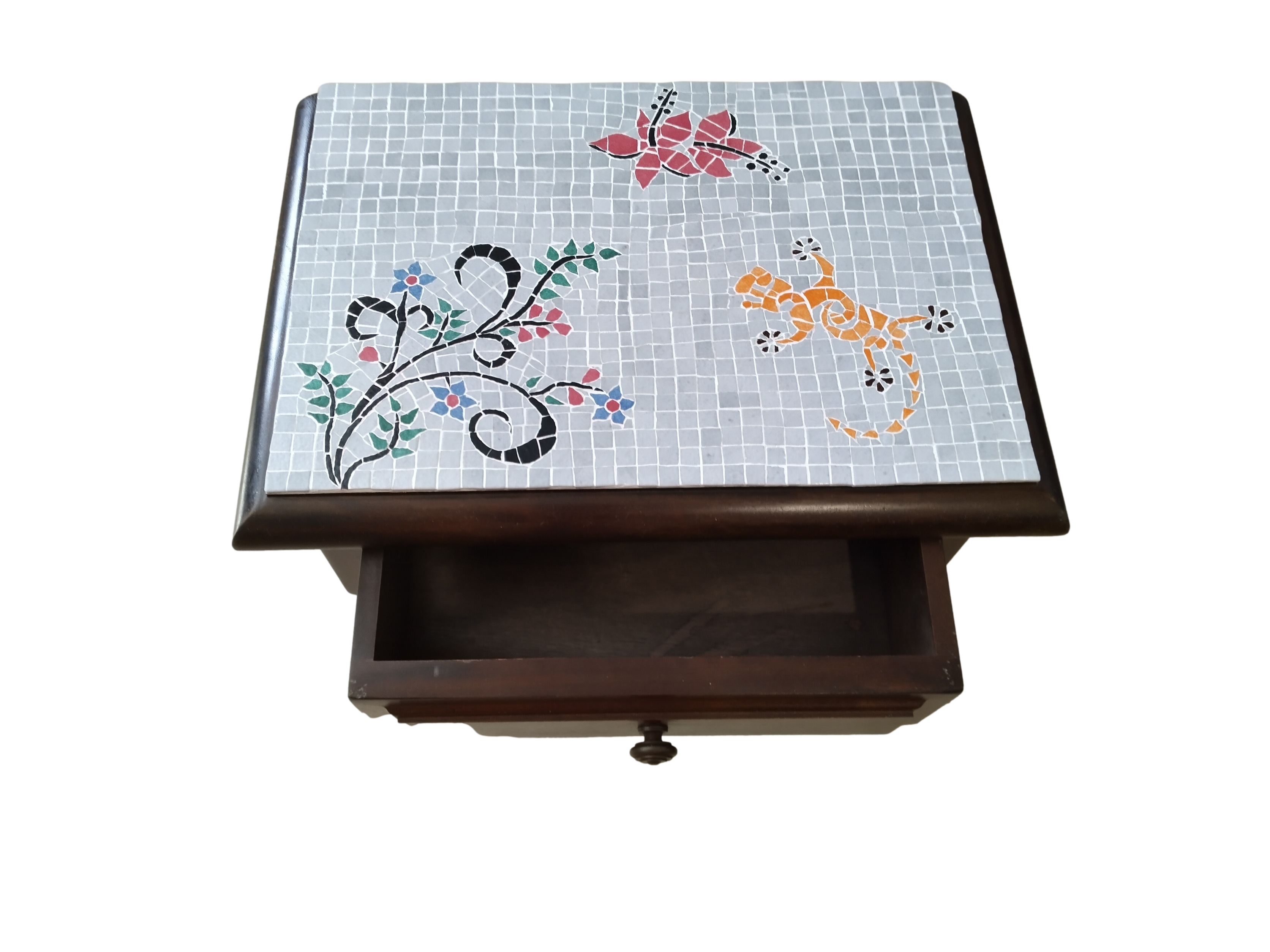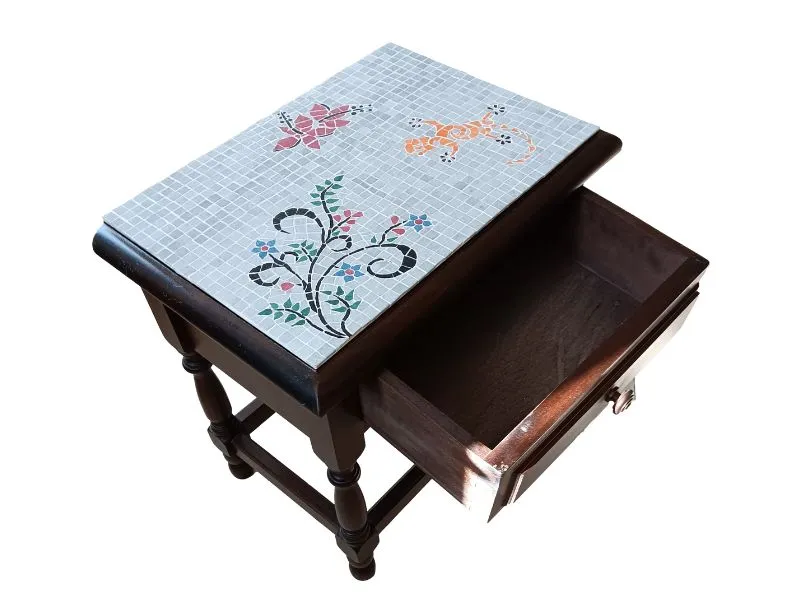 Cette table de chevet fleurie est une pièce artisanale conçue pour sublimer votre espace nuit avec une touche d’élégance et d’originalité. Chaque élément de son plateau a été travaillé à la main selon la technique de la mosaïque, dans un jeu de formes, de couleurs et de lumière qui attire le regard.